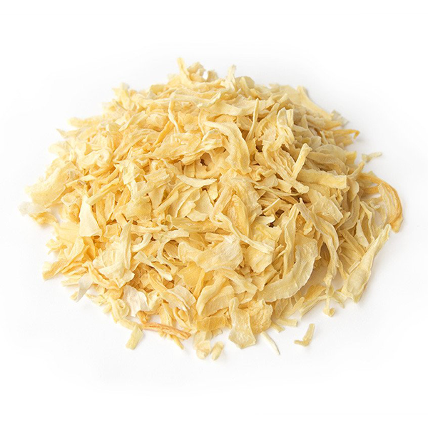 Сушеный лук очень низкое содержание натрия, жира и калорий. Лук содержит серу, витамины и железо, которые укрепляют нервы. Сушеный лук содержит пробиотики, улучшающие сон и даже снижающие стресс у человека. Когда кишечные бактерии переваривают пребиотическую клетчатку, они могут расширяться и улучшать здоровье кишечника. Сушеный лук содержит антиоксиданты, которые помогают предотвратить сердечные заболевания. Потребление сушеного лука также помогает системе кровообращения.